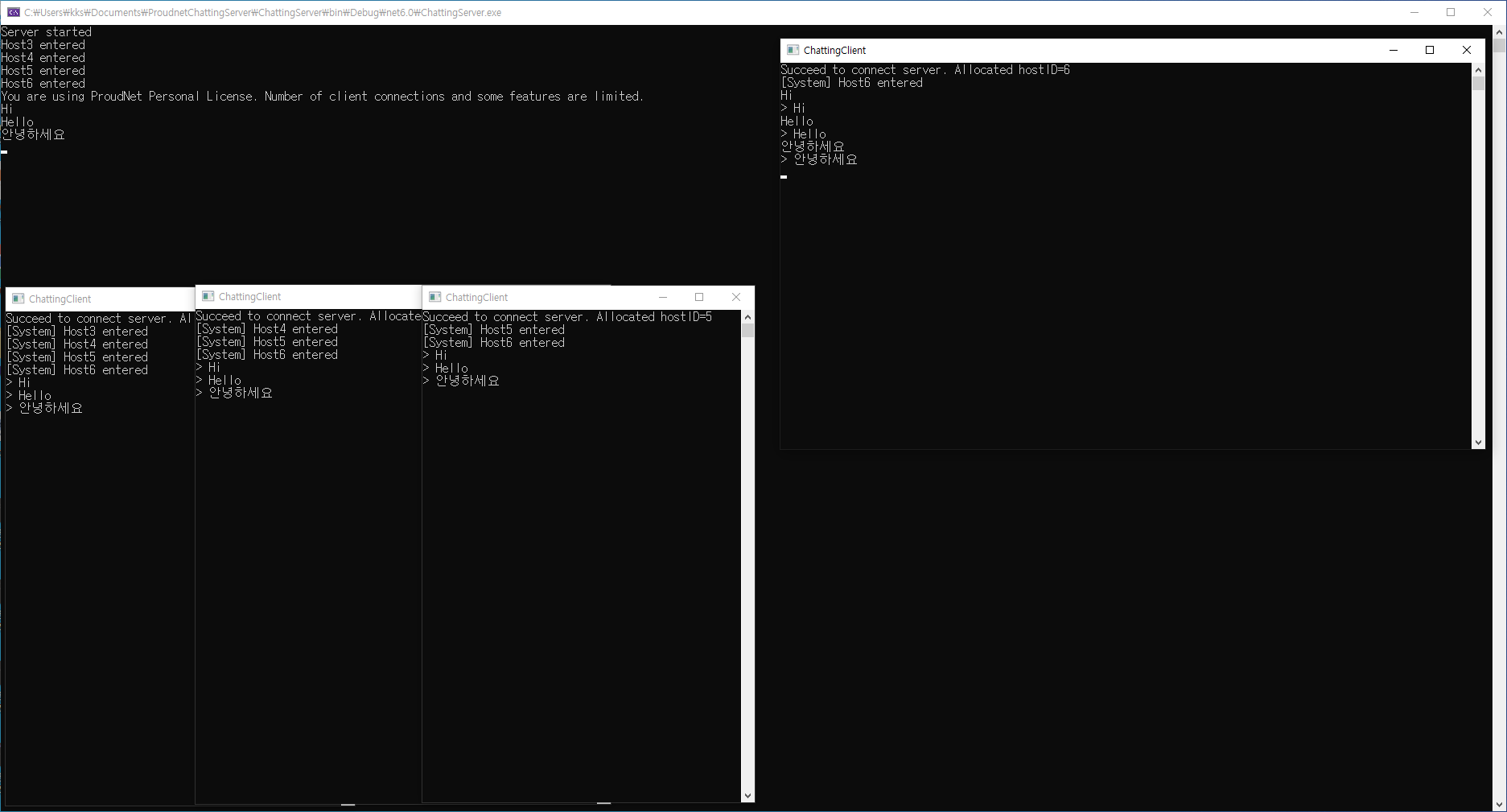 서버는 물론 다른 클라이언트들도 메세지를 출력하는 것을 볼 수 있습니다.