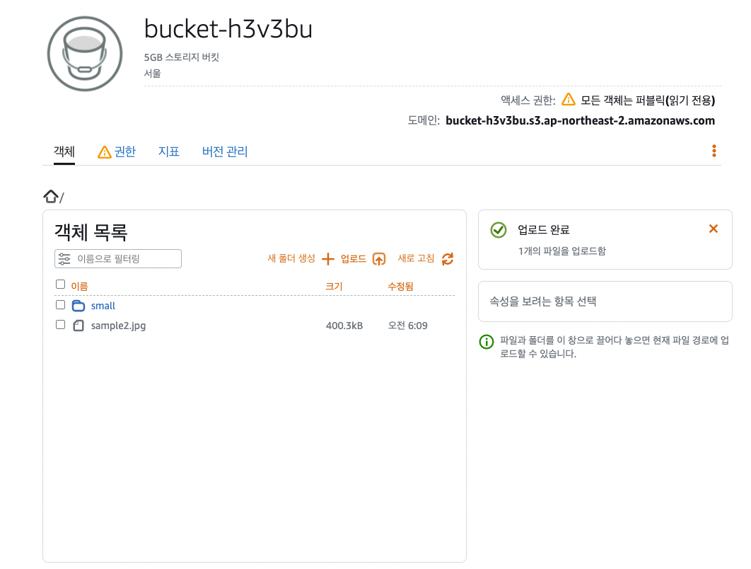 그 결과 sample2.jpg 파일이 업로드 되었으며 ( streamToBufferUpload 함수를 사용했으므로 ) sample 디렉토리가 생성되고 그 안에 리사이즈된 sample2.jpg가 업로드 되었습니다. ( 경로를 'small/<filename>'으로 지정했기 때문에 )