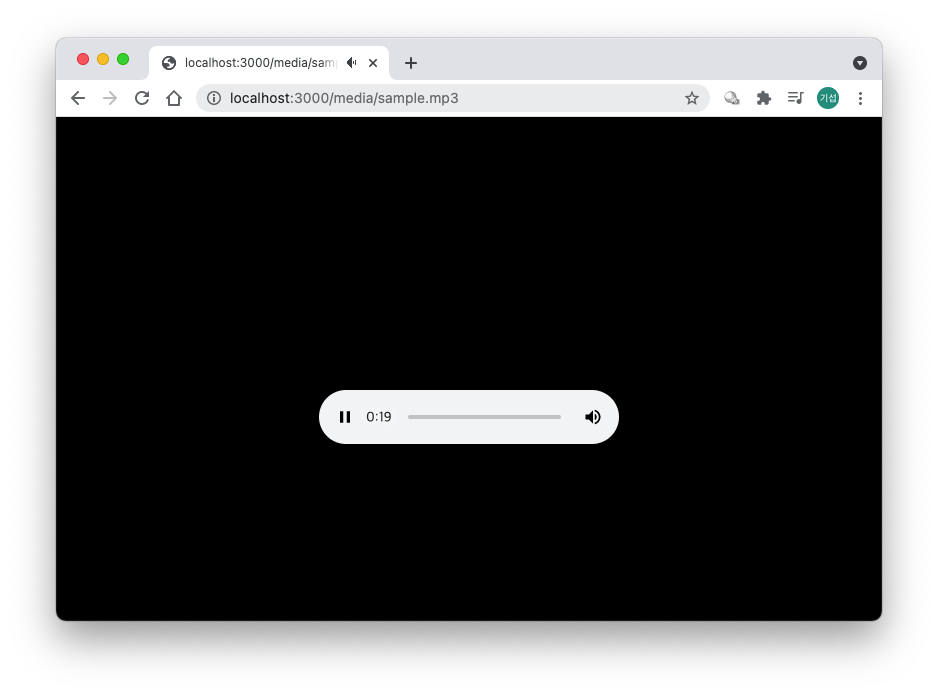 이제 다시 재생을 하면 일반적인 경우 잘 되는 것을 확인해보실 수 있습니다. 하지만 기능적으로 봤을 때, 몇 가지 헤더가 추가되었을 뿐 한 번의 요청에 전체 파일을 다 보내준다는 점에서 달라진 것이 없습니다. <끝 점> 의 정보를 파일의 끝으로 지정해놓았기 때문이죠.